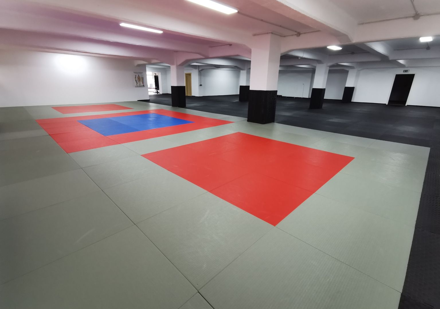 Unser Matte ist über 200m² groß und verhindert Verletzungen beim fallen. Sie besteht aus einer Tatami für Judo, Sambo, Kyusho-Jitsu, Small-Circle-Jujitsu und weitere Kampfsportarten. Dazu kommt eine schwarze Steckmatte für den Fitnessbereich.